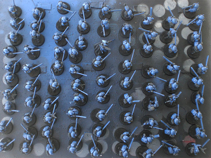 The first batch of models to be completed includes 84 Firewarriors and 2 Special Characters. This picture shows them all after they've been assembled, based and undercoated.